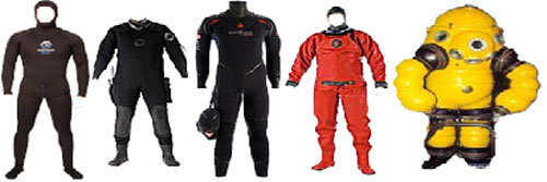 – Trajes calefactados: Trajes cuya protección térmica se realiza desde la superficie. Dos tipos, el primero a trabes de agua caliente suministrada a trabes de tubos de agua caliente. O eléctrico con filamentos calentados a bajo amperaje.