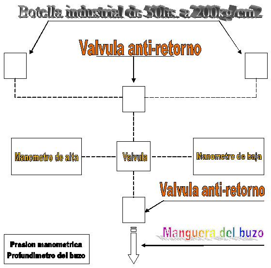 Deben disponer de dos conectores de 3/8” y se conectaran a la válvula que lleve el dispositivo anti-retorno. Es una manguera de plástico rígido de 8mm. Que en un extremo se coloca en la cintura o arnés del buzo, y el otro muere en el neuma de la caja de distribución.
