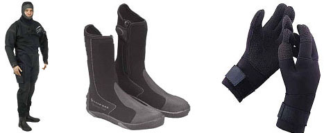 – Trajes secos: Construidos en Neopreno, Trilaminado o Loneta vulcanizada. Disponen de válvula de ataque (hincha el traje) y válvula de exaustación (bacía el traje). Cerrado con una cremallera estanca, el buzo se bisté con un mono térmico, también llamado Rata. De tela engomada (pueden tener casco y botas incorporadas).