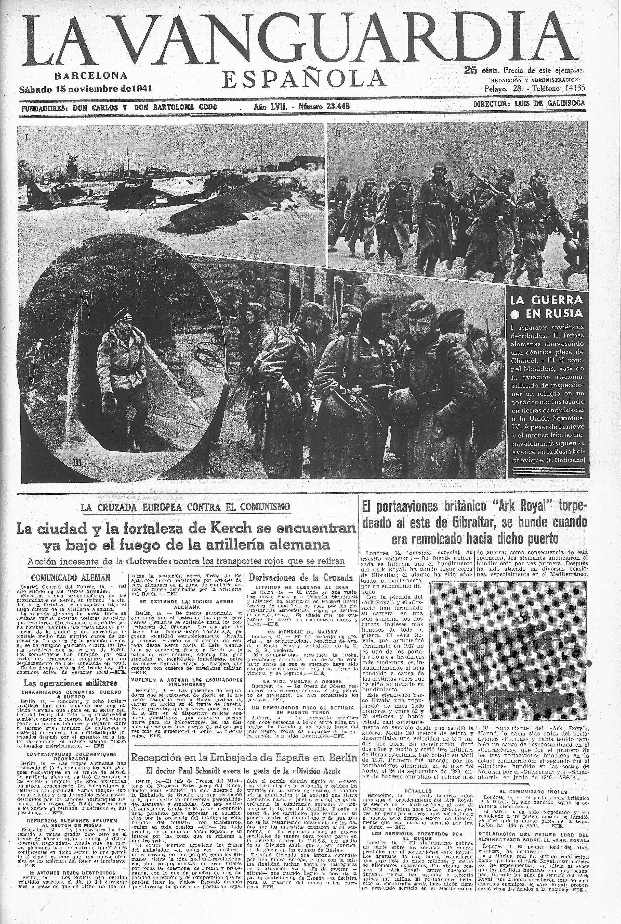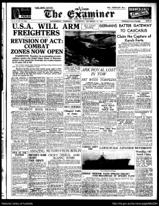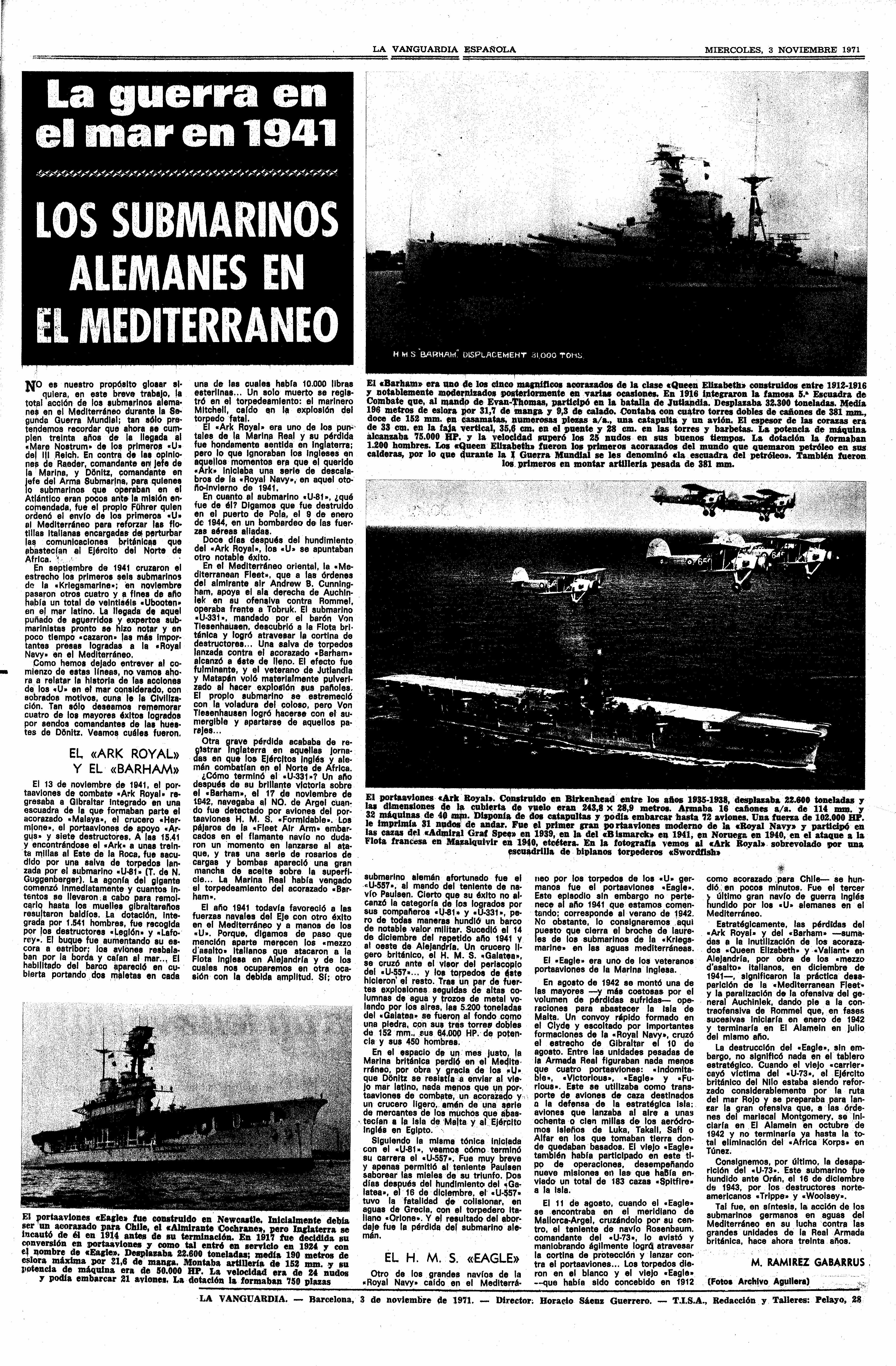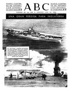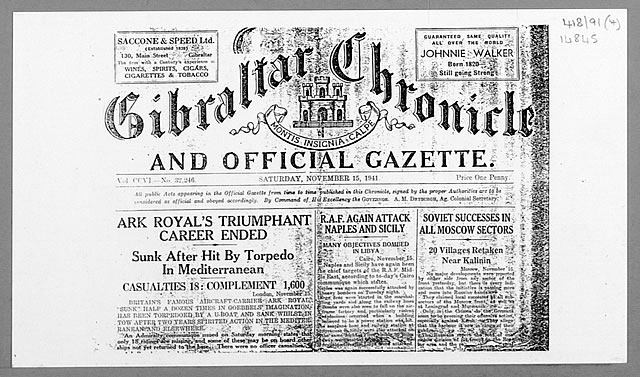 Hemeroteca Si bien no existe información determinante de la época, sobre el hundimiento del Ark Royal. Si se puede estudiar con facilidad lo publicado por los medios en los posteriores días a su perdida. Así como los comunicados emitidos por el Almirantazgo Británico sobre la pérdida de la nave. En ellos solo se hace referencia a su hundimiento al este de Gibraltar. Algo lógico teniendo en cuenta que los tiempos de guerra que corrían. En ellos solo se hace referencia genérica a su hundimiento. Al único muerto durante el ataque, el marinero Edward Mitchell. Y a las noticias recogidas por la agencia EFE, el 14 de noviembre del año en curso. Emitidas desde Estocolmo por el Almirantazgo Británico a trabes de la radio.